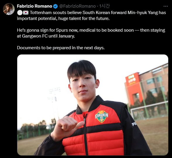 "토트넘 FC는 양민혁 선수와 싸인에 매우 근접해있다.곧 메디컬 테스트가 이어질 것이다."